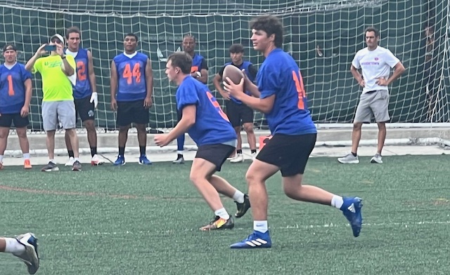 He’s shown a strong arm in the summer and an even disposition to combat the pressure of his elevated circumstances. In his first 7-on-7 game his first pass was intercepted, then he went 7-for-7 on the next series, culminating in a touchdown to Anthony Bokolas, and ultimately completed eight in a row.