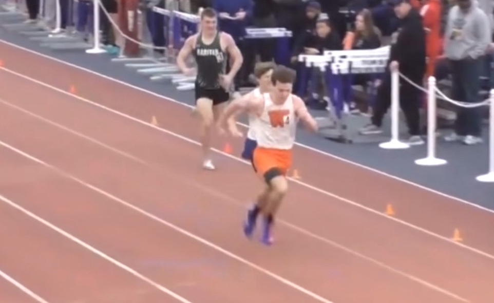 Here is a screen shot of Woodstown’s Josh Crawford taking the lead, then crossing the line to win the Group I boys indoor 800 meters Sunday. The photo at the top shows his moment of victory. (Photo by Robert Crawford)