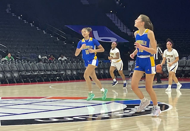 Pennsville’s Nora Ausland (10) and Jaida Burns (15) come across the center logo during the Eagles’ game with Clayton in the Wells Fargo Center. Top photo, Taylor Bass goes up for the opening tip to get the once-in-a-lifetime adventure started. (Submitted photos)