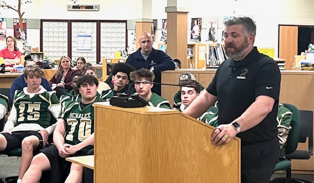Top photo: Kevin Leamy addresses the school board Thursday after being approved as Schalick’s new head football coach.