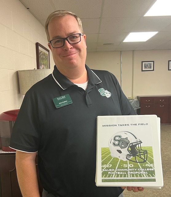 Salem CC athletics director Bob Hughes proudly displays the football proposal he distributed to the college’s board of trustees Thursday night.