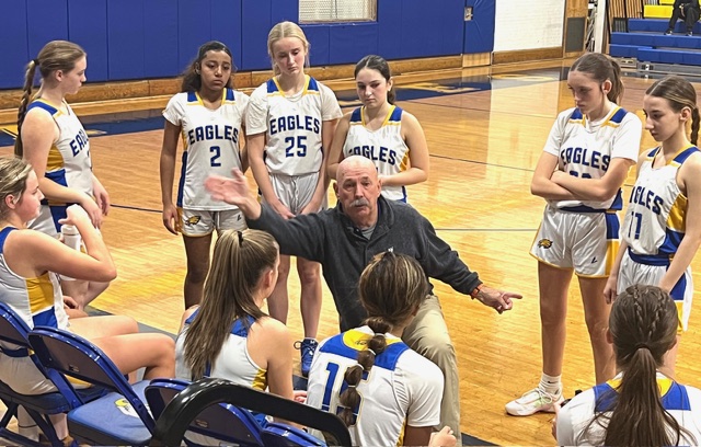 Top photo: Steve Merritt makes a point during a timeout in one of his first games as coach of the Pennsville girls basketball team.