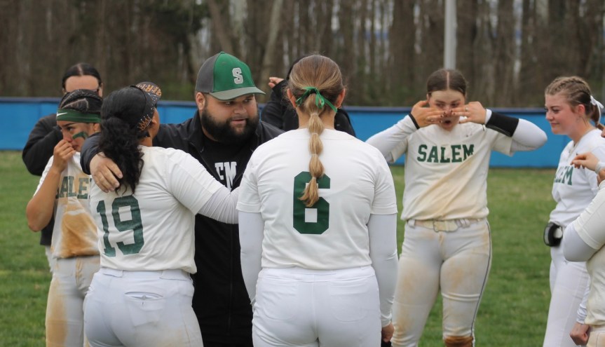 Players on the Salem CC softball team wipe away tears Friday as head coach Angel Rodriguez visits them for the first time since undergoing heart surgery last week. (Top photo) Angel Rodriquez talks with Tiana Wilson (19) and Sawyer Simmons (6) between games of their doubleheader (Photo by Tyler Hacker).